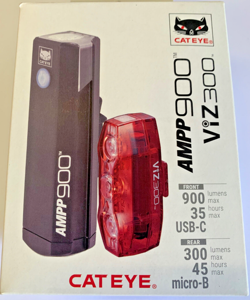 | Description | Code: CA490A900V300 CATEYE AMPP 900 / VIZ 300 BIKE LIGHT SET Cateye have paired 2 of their finest lights to give you the best technology all in one convenient & great value package. Ride into the night with the high intensity AMPP900 Headlight featuring OptiCubeâ„¢ lens technology for a wide beam and excellent side visibility for safety. AMPP900 FEATURES High power rechargeable headlight (900lm) Powerful wide beam with OptiCubeâ„¢ lens technology Excellent side visibility Long life high capacity lithium-ion rechargeable battery (Li-ion 3.7v 3000mAh) USB-C Built-in fast recharging circuit 3-level battery indicator (Blue: Above 50% Yellow: 30-50% Red: Less than 30%) USB-C rechargeable (cable included) Mode memory function Five light modes (High / Middle / Low / Daytime HyperConstant / Flashing) Turns on High mode with double-click of power button FlexTightâ„¢ bracket Helmet mount and centre fork bracket (optional) Long runtime Up to 35hrs Designed in Japan MODES / OUTPUT High - 900lm Mid - 400lm Low - 200lm Daytime Hyper Constant - 200+900lm Flashing - 200lm MODES / RUNTIME High - 2 Mid - 3 Low - 5 Daytime - 4 Flashing - 35 VIZ 300 FEATURES: 3 LEDs (300 lumens) Focused lens for maximum visibility Highly visible during daytime Superior 300 degree visibility Long rear beam projection Clear OptiCubeâ„¢ lens technology Lithium-ion rechargeable battery USB rechargeable (Micro-USB cable included) Low battery indicator 4 modes: Constant / Flashing / Group Ride / Daytime Hyperflash Mode memory function Battery Auto Save (The mode automatically changes to flashing when the battery power gets low.) New seat post bracket SP-15 which fits contemporary (Kammtail) aero seatpost Snap Systemâ„¢ bracket Weight: Only 47g Designed in Japan RUNTIME: Constant (30 lumens)?5 hrs Flashing (30 lumens)?45 hrs Group Ride (100 lumens)?8 hrs Daytime Hyperflash (300 lumens)?10 hrs Charging time (From empty) : 3 hrs TECHNOLOGIES: OptiCubeâ„¢ Our proprietary OptiCubeâ„¢ lens technology maximizes brightness for greater visibility. FlexTight Bracketâ„¢ (AMPP 900) The FlexTight bracket can be quickly and securely fastened to the handlebars providing micro adjustability without the need for tools. Low Battery Indicator (AMPP900) Alerts when remaining battery gets low USB-C (AMPP900) Fast charging Side Visibility Provides visibility from the side to increase safety. Daytime Can be used in the daytime. All Weather IPX4 Can be used in rainy weather. Snap Systemâ„¢ (ViZ 300) Allows riders to place rear lights on various locations in both horizontal and vertical orientations. |