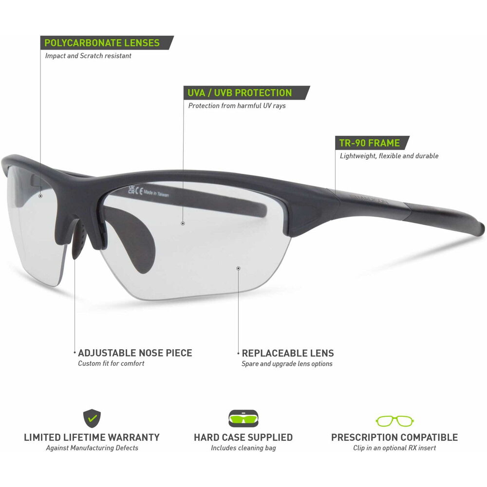 | Description | The Mission is the most versatile of all our glasses, at home on the road, on the trail, or sitting outside the pub when the pedalling is finished. Featuring performance polycarbonate lenses you get great optical clarity along with full UVA and UVB protection Features: Polycarbonate Lenses: Optics from Madison meets the highest standard for eyewear; ISO 12312. The interchangeable polycarbonate lenses are both impact and scratch-resistant. The lenses offer both supreme optical clarity and UV-A and UV-B protection Multi-Purpose: Both versatile and stylish, Madison Optics maintain their good looks on the road or trails TR-90 Frames: TR-90 plastics are lightweight, flexible and durable. TR-90 plastic memory allows them to flex and return to their original shape without breaking or bending Secure Fit: Our frames work seamlessly with your helmet with non-slip rubber tips for maximum comfort and security. The flexible nose-piece allows you to dial in the perfect fit, adjusting for extra venting if desired Prescription: Can you see clearly when you're riding? Clip in our compatible RX insert behind the lens to deliver full prescription vision and improve the detail of every ride Lenscare: All our sunglasses come with a storage pouch with drawstring closure that doubles as a cleaning cloth Size Spec: Lens Width: 63mm, Lens Height: 41mm, Frame Width: 140mm, Bridge Height: 10mm, Arm Length: 122mm |
