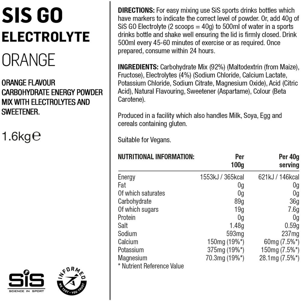 | Description | GO ELECTROLYTE DELIVERS ENERGY AND PROMOTES HYDRATION GO Electrolyte contains a blend of an easily digestible carbohydrates as well as electrolytes (such as sodium) that promote optimal hydration to keep your muscles performing on longer hotter rides where sweat loss is a factor Features: FORMAT: A combination of energy sources and electrolytes enhance your body's ability to absorb water during exercise, maintain your endurance performance and protect against cramp. The product is mixed at appropriate concentrations of carbohydrate (36 grams as a 6% solution), sodium (20 mmol/L) and fluid (500ml serving) in order to achieve the combined aims of energy and hydration MIX: Simply add 40g of GO Electrolyte (2 scoops = 40g) to 500ml of water in a bottle and shake well ensuring the lid is firmly closed CONSUME: Drink 500ml every 45-60 minutes of exercise or as required FLAVOUR: 4 taste options - Lemon, Blackcurrant, Tropical, Orange WITHOUT: No artificial sweeteners INFORMED SPORT: All Science in Sport products are tested under the Informed Sport programme and does not contain any banned substance SUITABLE FOR: Vegans, Vegetarians, Lactose free, Gluten Free, Wheat Free, Nut Free, Soya Free |